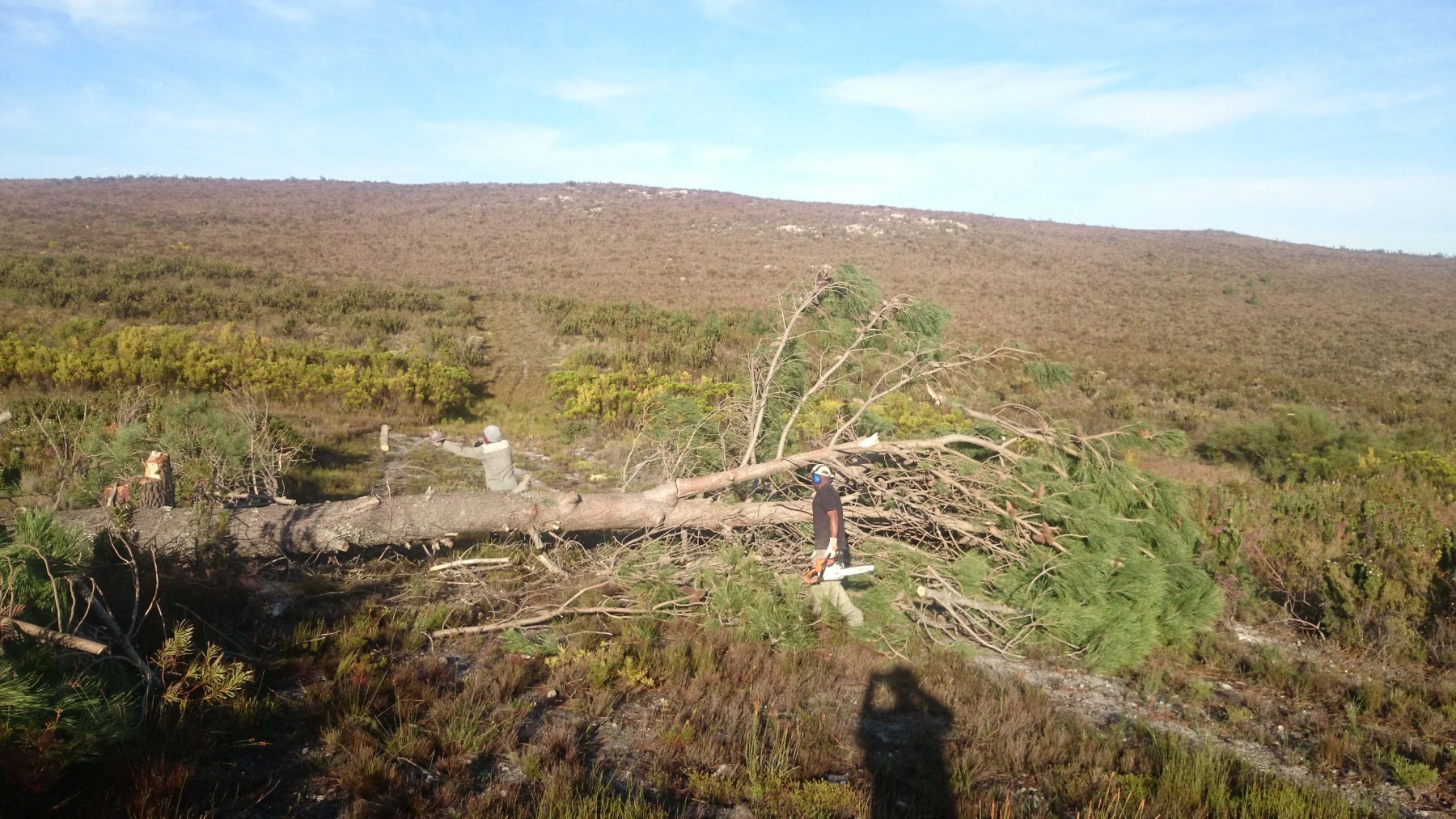 So werden am Kap diejenigen Neophyten aus Übersee genannt, die die einheimische Flora überwachsen und dadurch vollkommen verdrängen. Darunter sind invasive Arten aus Australien: Eukalyptus, Port Jackson und etliche andere besonders schnell wachsende Bäume, die sich massenhaft vermehren und von Feuer sogar noch profitieren: weil sie daran angepasst nach jedem Feuer in noch größerer Anzahl keimen …. Wir kämpfen gegen diese Alien indem wir sie auf möglichst großer Fläche entfernen oder zumindest ihre Ausbreitung verhindern.