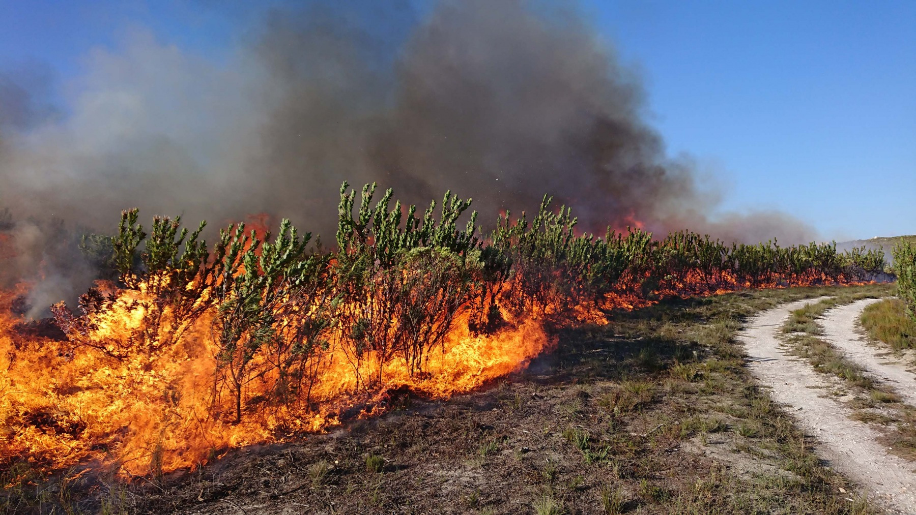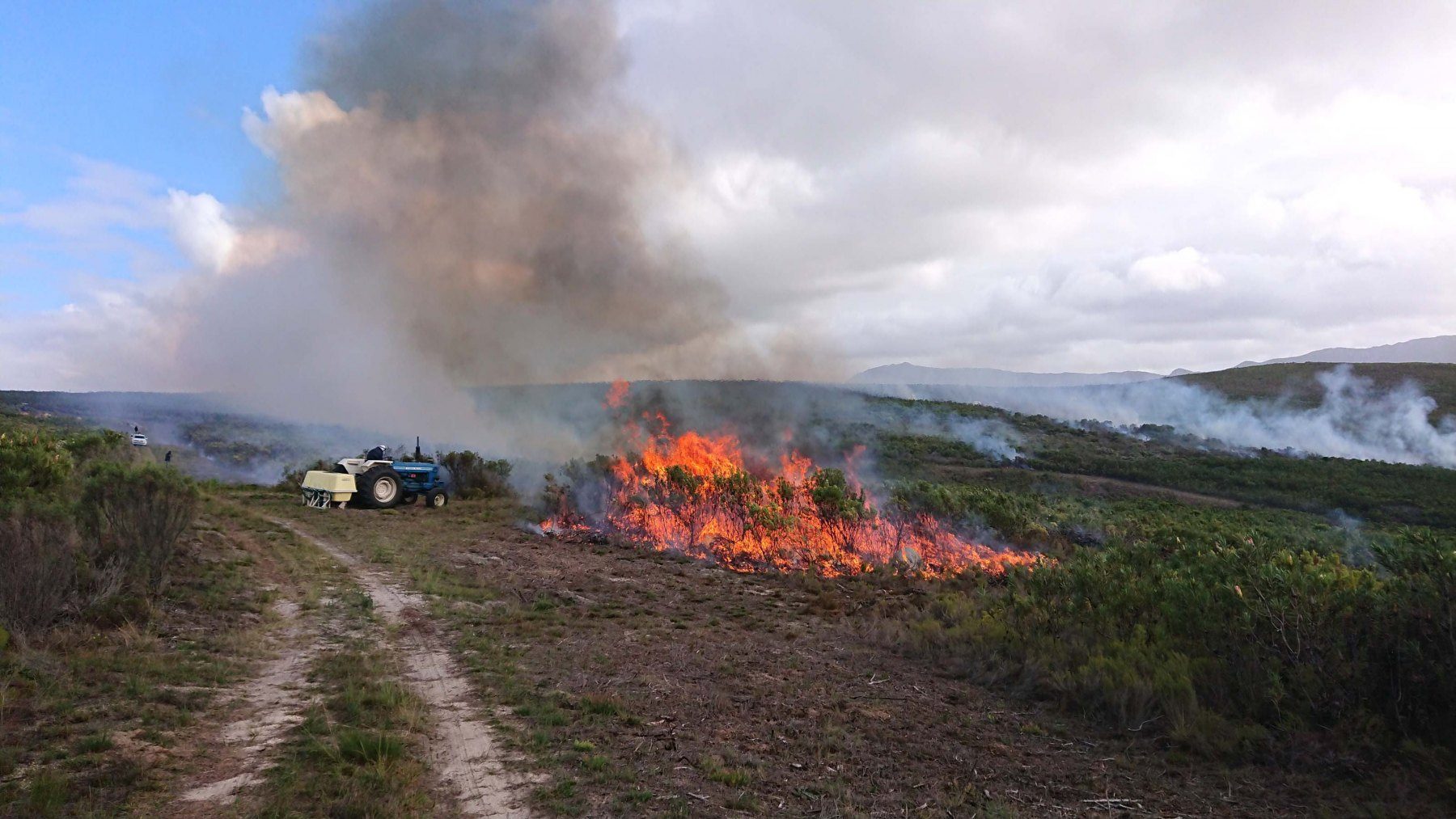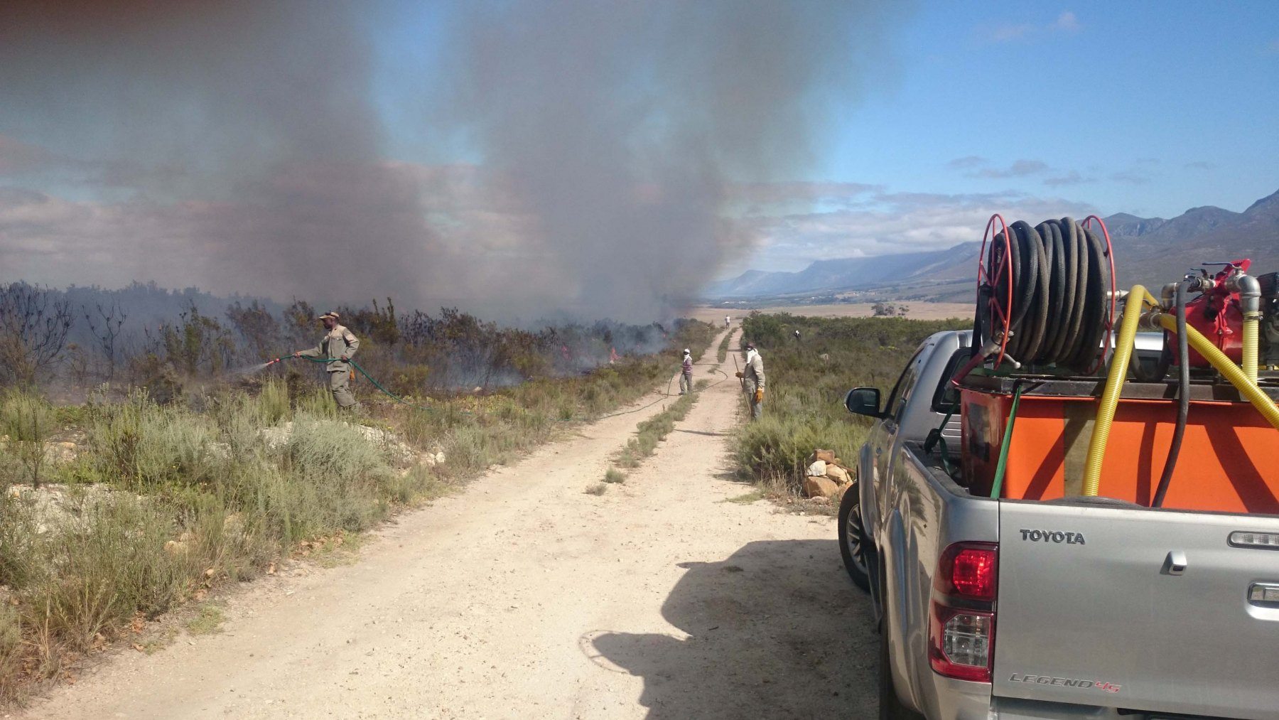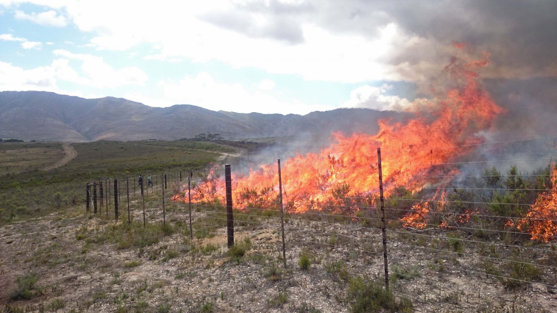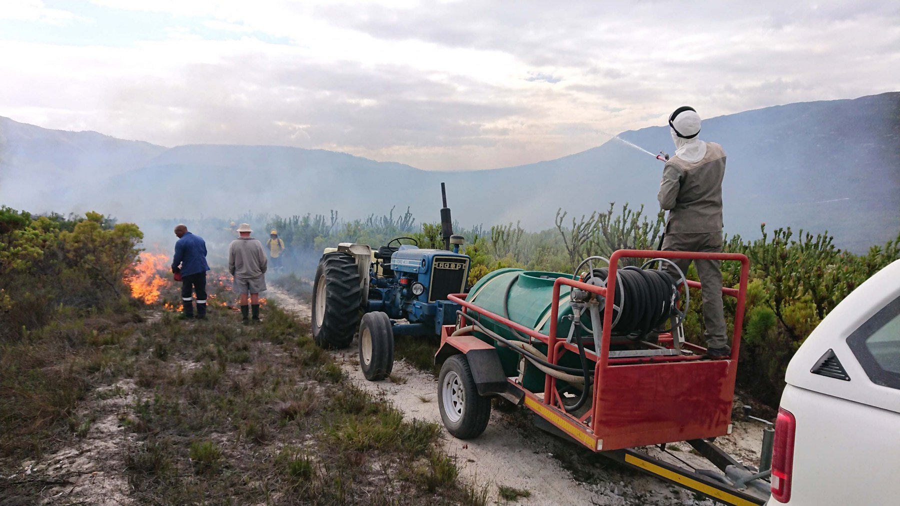 Der FYNBOS muss alle 8 bis 25 Jahre brennen! Daran sind seine Pflanzenarten angepasst und für viele von ihnen bedeutet Feuer der Start einer neuen Generation. Zu häufige „Wild-Fire“ sind schlecht, denn dann sind die Samenbanken noch nicht wieder aufgefüllt, zu selten ist auch nicht gut, denn dann wird die Wartezeit für Knollen und Zwiebeln zu lange. Aus diesem Grund organisieren wir jährlich am Ende des Sommers kontrollierte Brände auf aufwändig vorbereiteten Flächen. Das Wetter mit leichtem aber beständigem Wind muss stimmen, die Mannschaften, die das Burning durchführen müssen gut ausgebildet sein, das Equipment muss passen. Bakkie-Sakkies ermöglichen das Arbeiten mit Wasser, Ground-Teams arbeiten mit Feuerklatschen und Hacken. Es ist jedes Mal spannend und es ist klar: das Feuer kann auch ausbrechen…