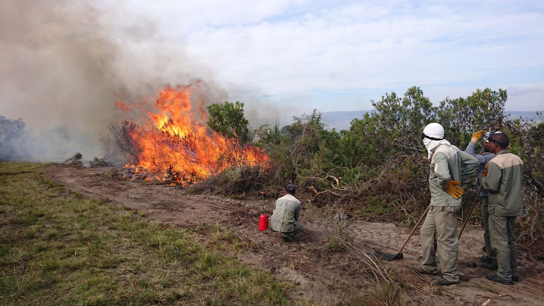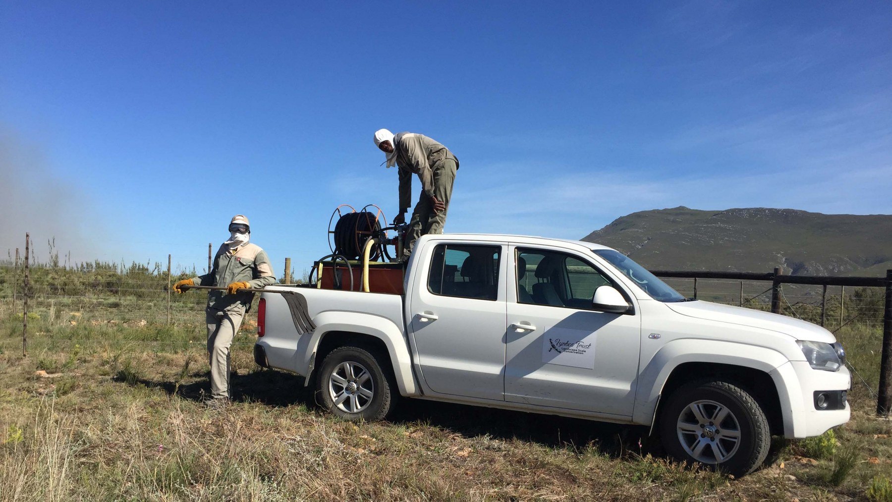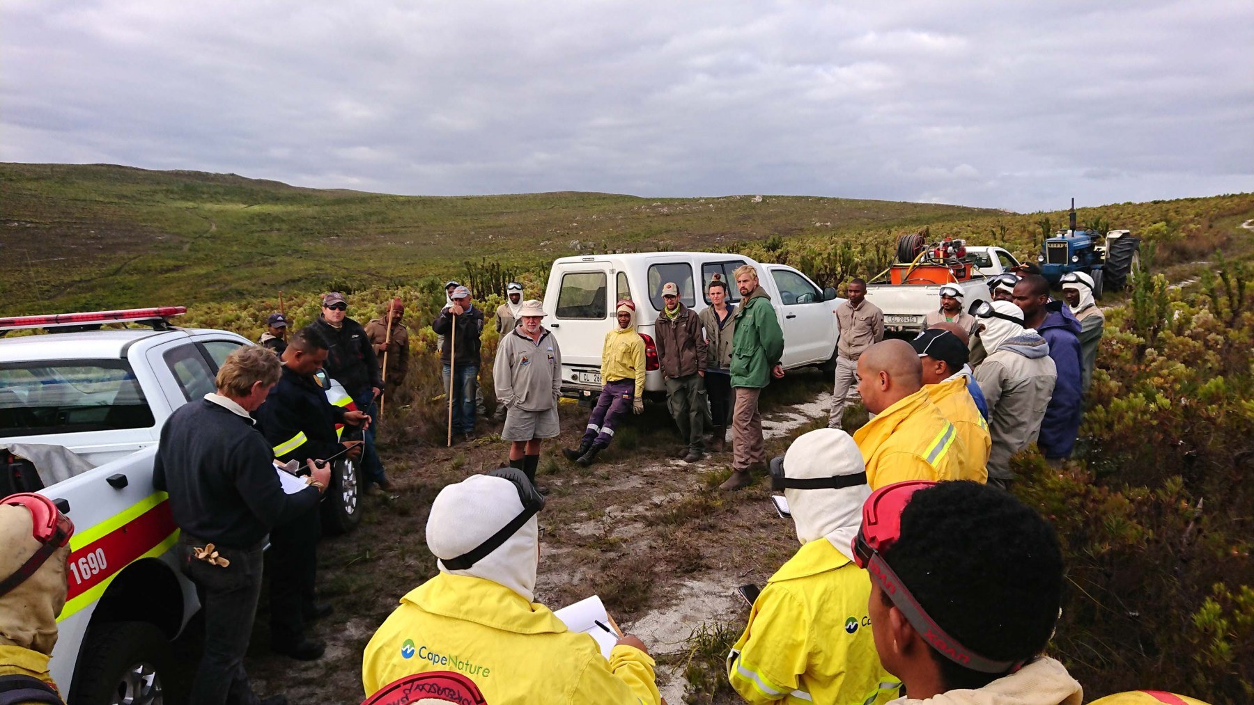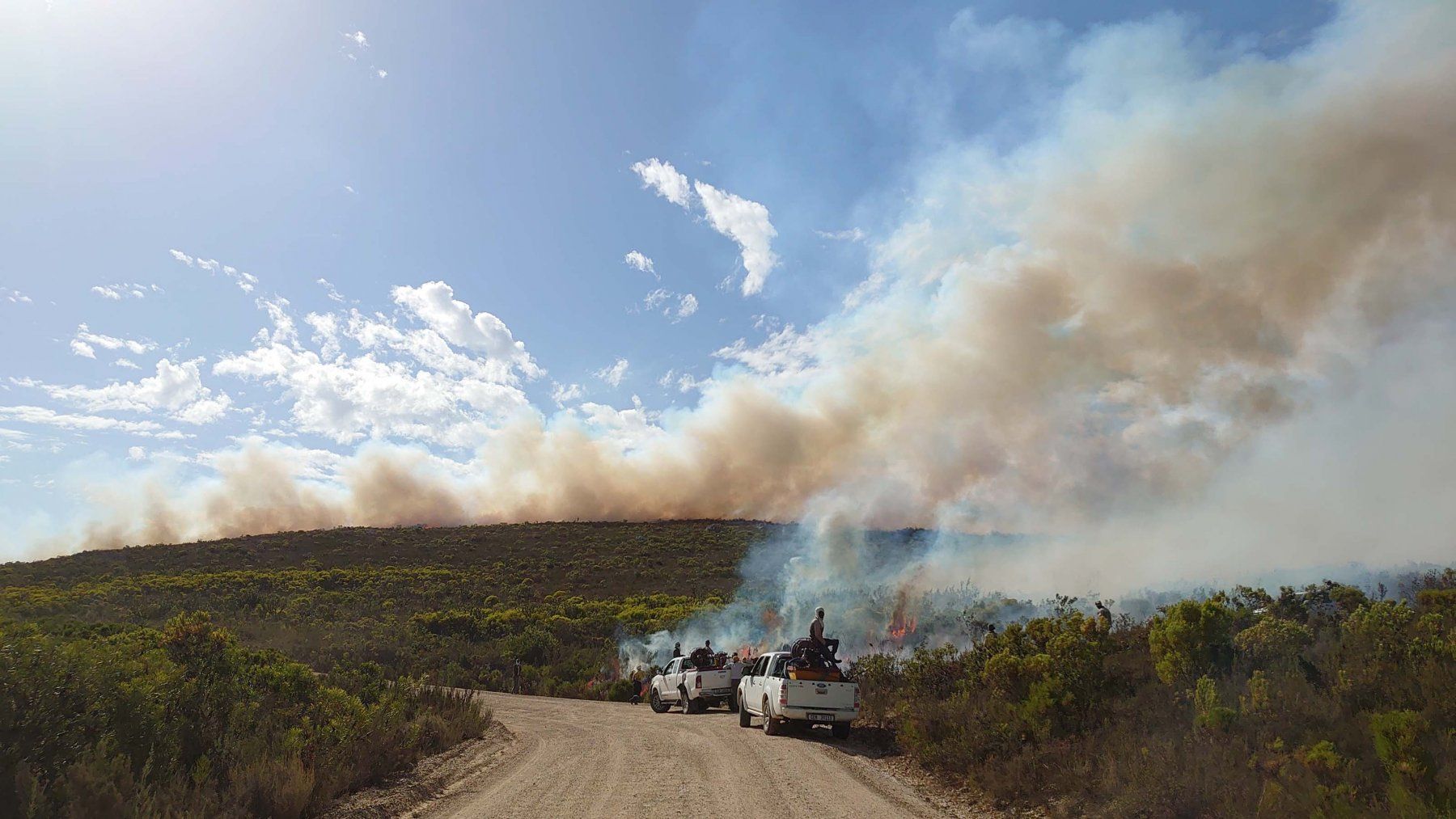 Der FYNBOS muss alle 8 bis 25 Jahre brennen! Daran sind seine Pflanzenarten angepasst und für viele von ihnen bedeutet Feuer der Start einer neuen Generation. Zu häufige „Wild-Fire“ sind schlecht, denn dann sind die Samenbanken noch nicht wieder aufgefüllt, zu selten ist auch nicht gut, denn dann wird die Wartezeit für Knollen und Zwiebeln zu lange. Aus diesem Grund organisieren wir jährlich am Ende des Sommers kontrollierte Brände auf aufwändig vorbereiteten Flächen. Das Wetter mit leichtem aber beständigem Wind muss stimmen, die Mannschaften, die das Burning durchführen müssen gut ausgebildet sein, das Equipment muss passen. Bakkie-Sakkies ermöglichen das Arbeiten mit Wasser, Ground-Teams arbeiten mit Feuerklatschen und Hacken. Es ist jedes Mal spannend und es ist klar: das Feuer kann auch ausbrechen…