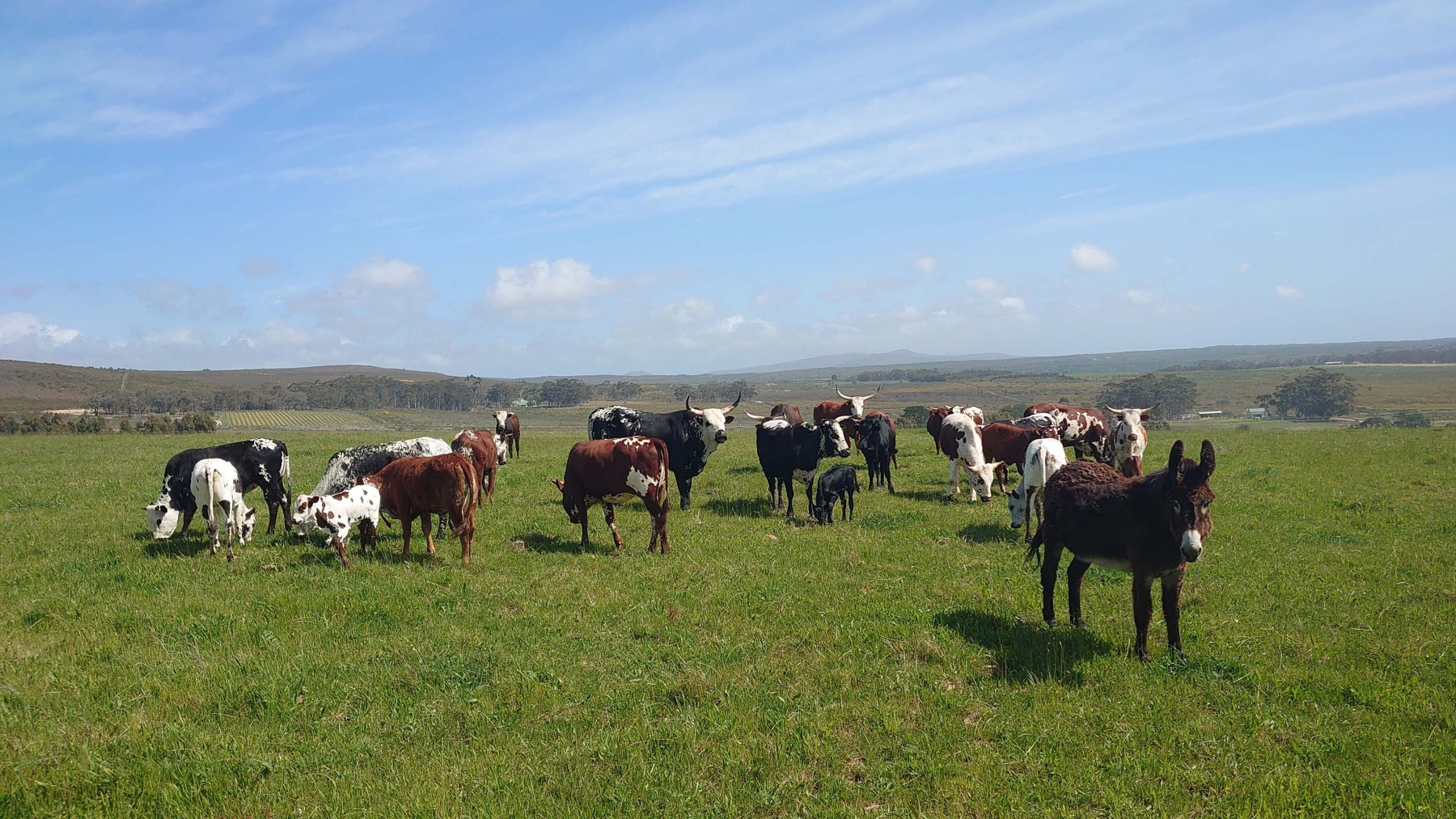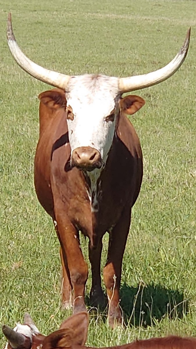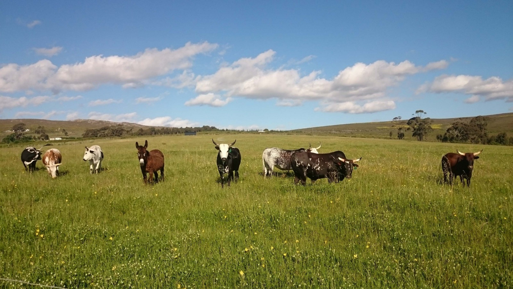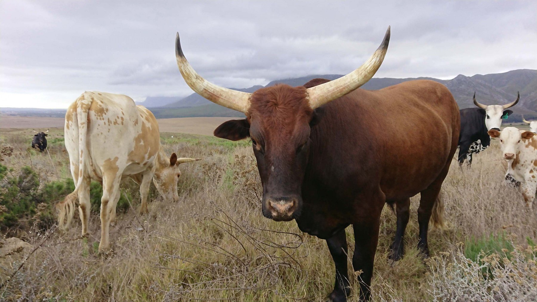 Seit mehreren tausend Jahren lebt diese afrikanische Rinderrasse eng mit Hirtenvölkern zusammen. Sie sind genügsam und robust, beim Kalben brauchen die Kühe keine Hilfe, da sie besonders kleine Kälbchen bekommen. Unsere Zucht startete 2014 mit einem Bullen, 3 Jungkühen und zwei jungen Ochsen: Rump und Ripeye. Inzwischen ist die Herde auf über 30 Tiere angewachsen, obwohl wir mehrere Tiere jedes Jahr schlachten: ohne Transport-Qualen beendet der Jäger auf „humanste Weise“ mit einem einzigen Schuss das friedliche Leben auf der Farm, wo die Rinder ohne jedes Zufüttern „grassfed“ durchaus fett werden.